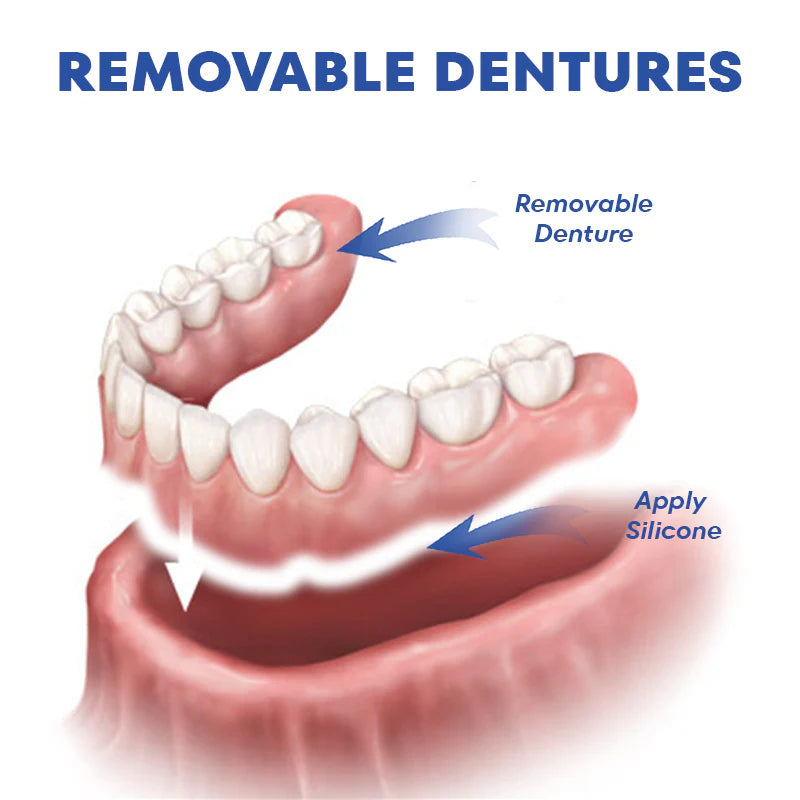 The moment the silicone is applied, it magically molds to every curve and crevice of your mouth, promising a fit so snug and comfortable you'll forget they're not your natural teeth. This bespoke fit not only elevates your comfort level but also secures your dentures firmly in place, freeing you to live, laugh, and dine without worry.